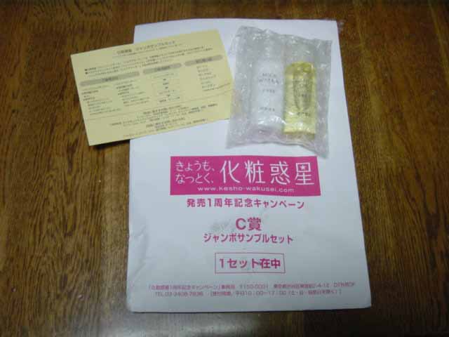 | 2002/06/06 化粧惑星 ![]() | 帰ったら、封筒が届いていました。 なんと、化粧惑星(コンビニコスメ)の懸賞に当たっていたのだよ。といっても、欲しかったものではなく残念賞のサンプルセット。 クレンジングとローションのセットでした。 最近けっこう懸賞当選率が高くてうれしいけど、こんなとこでちょこちょこ運を使わず、どかーんと一発大きく運を使ってみたいのぅ(笑) |