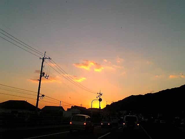 仕事帰りにきれいな夕焼けを見ました。 「秋の日はつるべ落とし」というけれど、帰り道は西へ向かって走っているので夕焼けを追いかけている気分。 夕焼け雲がぽっかり浮かんでいて、それはまるでふわふわの毛皮を空にはりつけたようだったよ。(写真に撮れなかったのが残念) 信号が変わる一瞬のあいだに携帯のカメラで撮ってみました。 |