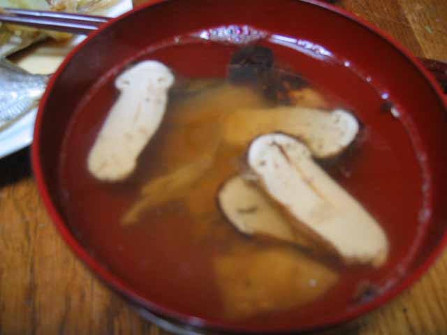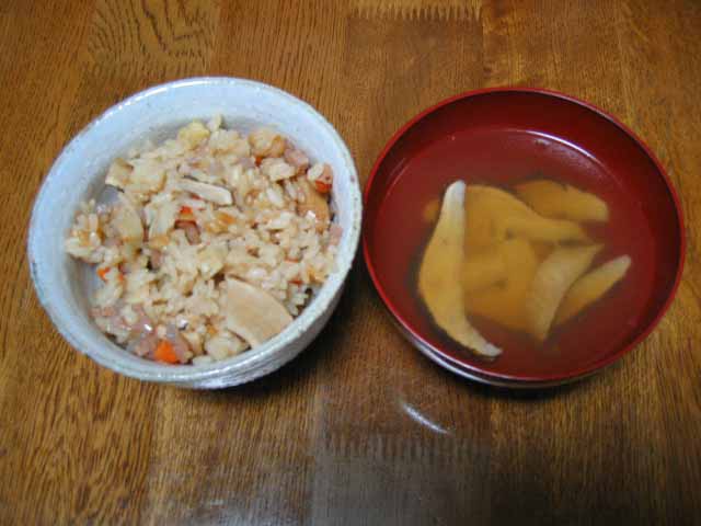 今回は、まつたけの炊き込みご飯とお吸い物! いやあ、おいしいわー。まつたけの炊き込みごはんは最高だねー。もうお刺身がかすんじゃうくらいだよ。 土瓶蒸しは外でおいしく食べるものってことにしてるけど、炊き込みご飯はおうちで食べるもんだねぇ。まいうー! |