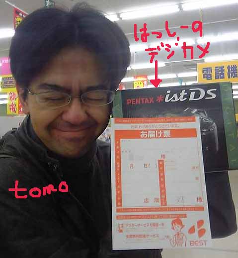 きのうの午後、ふーみん電器で「ファイルサーバー用に安いパソコン本体のみが欲しい」って話してたら「明日の特価品の整理券、並んでとってみたら?」って話に。うーん、でも早起きできるか心配・・・ってことで、mitchさんにお願いして並んでもらいましたの(鬼) おかげさまでSOTECのPC STACION PV2270Cをゲットできましたっ。mitchさんありがたうっ! メモリ256M足して512Mにして、5年補償もつけて、特価品のフラッシュメモリー128M(これはおねぃのもらった整理券でゲット)もあわせて、なんとろくまんえんっ!ふーみん、いつもありがたうっ! 15インチ液晶ディスプレイは父に使ってもらうことになったのだよ。 |
