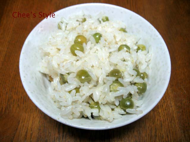 グリンピースごはんを食べています。