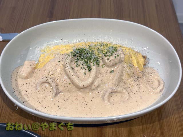 イカと明太クリームオムライス(サラダ・小鉢・ミニクレープつき) 1,550円。